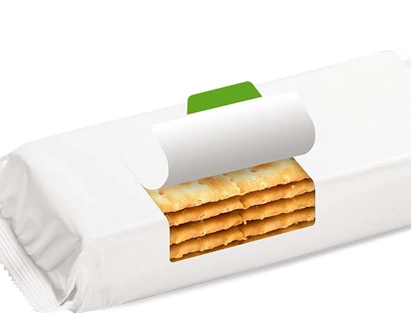 Voor het hersluiten van koeken of zoute koekjes in een pak of flowpack met tray is er het geïntegreerde label.